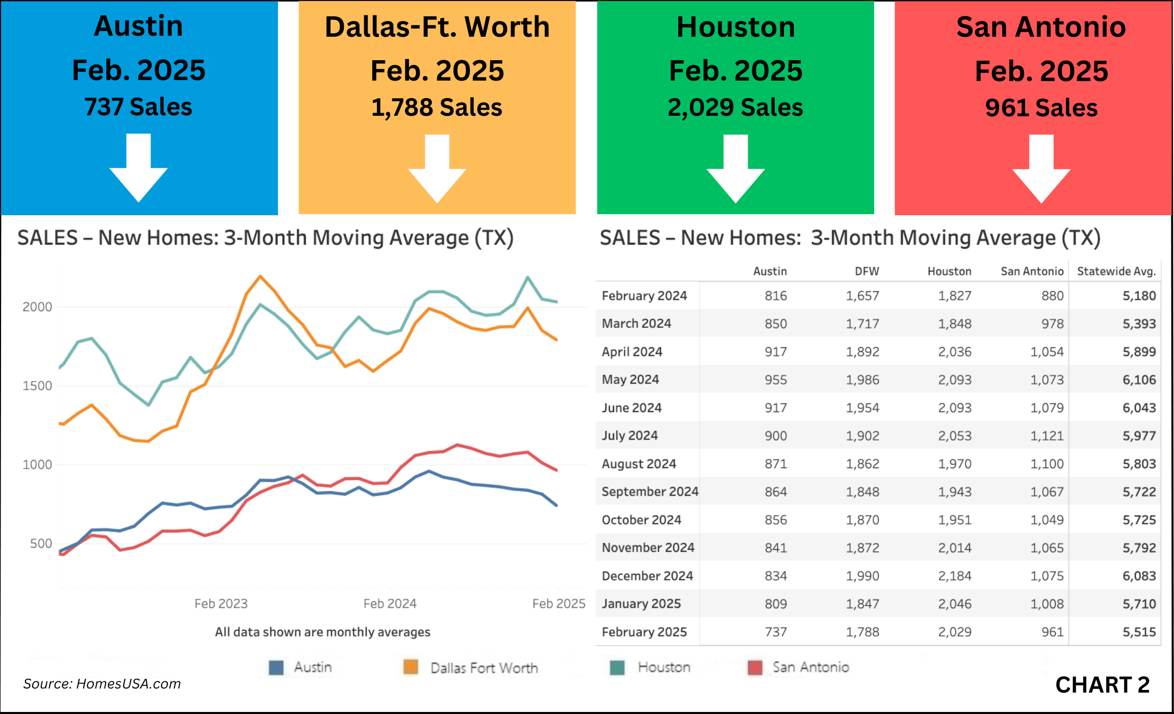 Based on all local MLS data, the most reliable and current source of all home sales activity, total new home sales continued to decrease in the four largest new home markets in Texas last month. The February 3-month moving average of new home sales in Dallas-Ft. Worth was 1,788 versus 1,847 in January. In Houston, total new home sales in February were lower at 2,029 versus 2,046 in January. In Austin, new home sales last month were 737 versus 809 in January. In San Antonio, new home sales in February were also lower at 961 versus 1,008 in January. (See Chart 2: Texas New Home Sales)