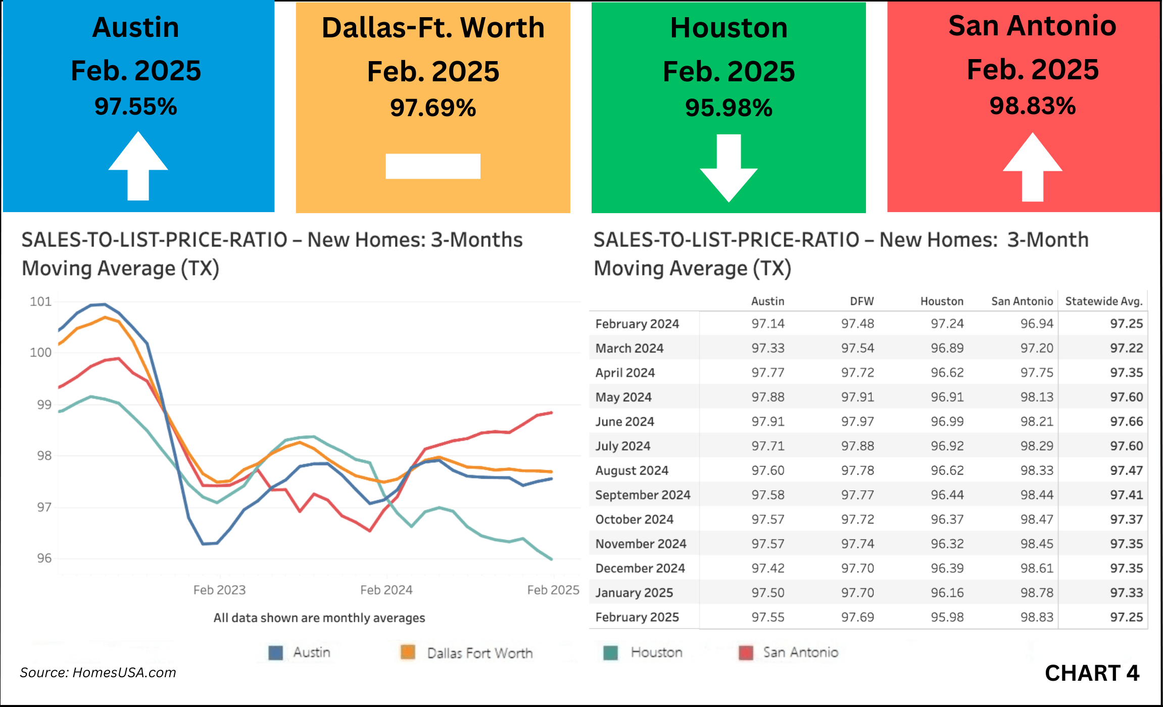 Cumulative new home sales remain slightly lower than 100 percent of the asking price. The combined 3-month moving average of the sales-to-list price ratio in Texas’ four largest markets for February was 97.25 versus 97.25 percent a year ago and 97.33 percent last month. Dallas-Ft. Worth’s ratio in February was 97.69 versus 97.48 percent a year ago and 97.70 percent last month. In Houston, the ratio in February was 95.98 versus 97.24 percent a year ago and 96.16 percent last month. In Austin, the sales-to-price ratio in February was 97.55 versus 97.14 percent a year ago and 97.50 percent last month. San Antonio's ratio in February was 98.83 versus 96.94 percent a year ago and 98.78 percent last month. (See Chart 4: Texas Sales-to-List Price Ratio)