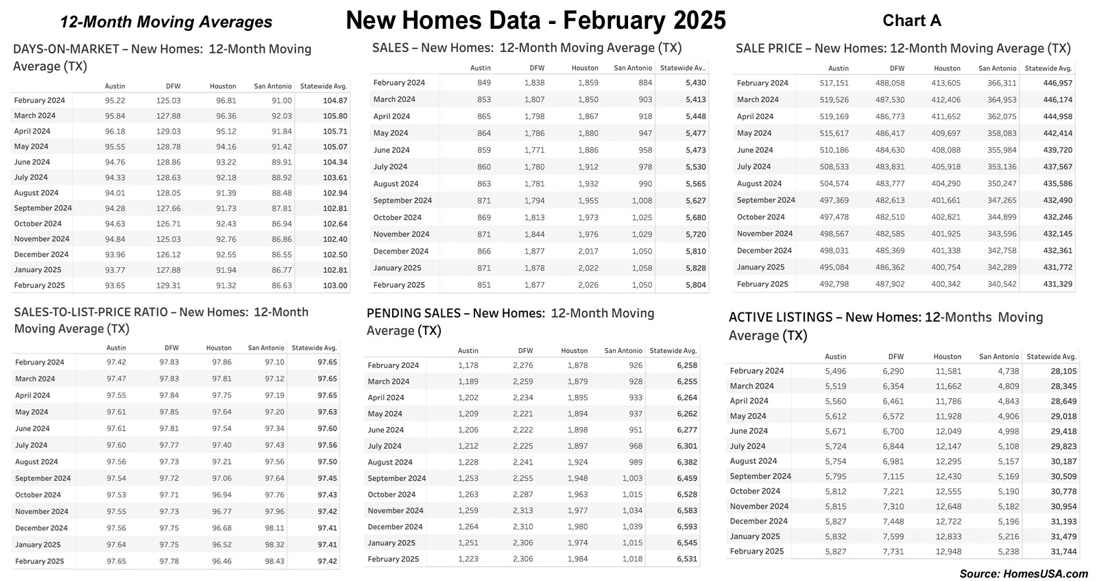 The HomesUSA.com Index is reported as both a 3-month and 12-month moving average of the Days on Market for new homes listed in the local Multiple Listing Services (MLSs) for Dallas-Ft. Worth, Houston, Austin, and San Antonio. Created by Ben Caballero, it is the first Days on Market index to track the Texas new home market and includes homes listed while under construction. (See Chart A: 12-Month Moving Averages)